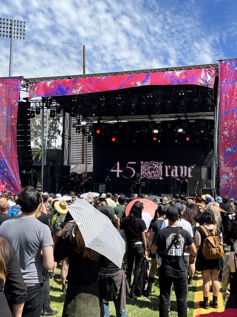 Our next step was over to the small stage to hear “45 Grave” with lead singer Dinah Cancer belt out some vintage horror punk songs like “Partytime” and “Evil”. It is always odd to see a band that was been crafted for a dark filled room to be performing outdoor in the bright sun, but they pulled it off.